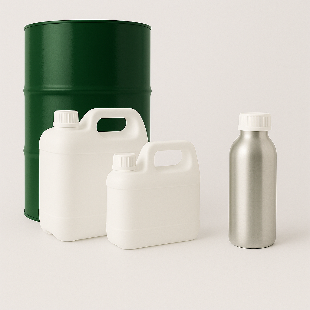 Unsere Verpackungslösungen werden speziell für die Lagerung flüchtiger oder halbflüchtiger aromatischer Substanzen ausgewählt und erfüllen die Anforderungen an Stabilität, chemische Inertheit und Nichtwechselwirkung zwischen Behälter und Inhalt. Aluminium: hohe Barriere gegen Sauerstoff und Licht, gute chemische Inertheit, geeignet für Lebensmittel- und Kosmetikanwendungen. Technische Polymere: Auswahl hochdichter Kunststoffe (HDPE, PET, PP), getestet auf Kompatibilität mit aromatischen Verbindungen gemäß den Normen EU 10/2011, FDA CFR 21. Wenn Sie den gesuchten Rohstoff oder Verpackungstyp nicht finden können, zögern Sie nicht, unsere Verkaufsabteilung zu kontaktieren. Lieferung oder logistische Bereitstellung innerhalb von 2 bis 16 Werktagen, abhängig von der für die Freigabe der Qualitätskontrolle benötigten Zeit. Von KI vorgeschlagene Bilder, nicht vertraglich bindend.